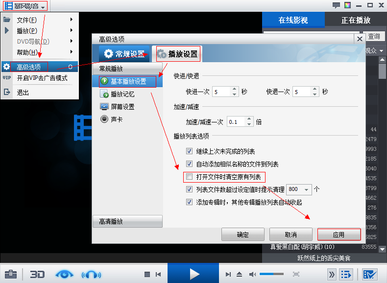 请您进入主菜单——高级选项——播放设置——基本播放设置中,查看您是否勾选”打开文件时清空原有列表”