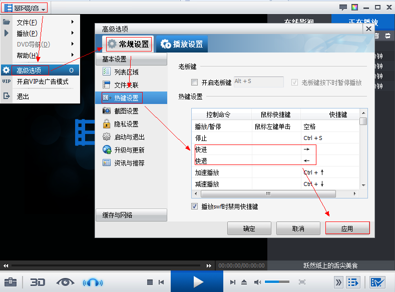 目前暴风暂时只支持本地视频和在线暴高清视频的快进/快退。暴风5的默认快进快退的快捷键为【快进 →】和【快退 ←】,可以使播放快进5秒或快退5秒。您可以进入高级选项——常规设置——热键设置中设置快捷方式