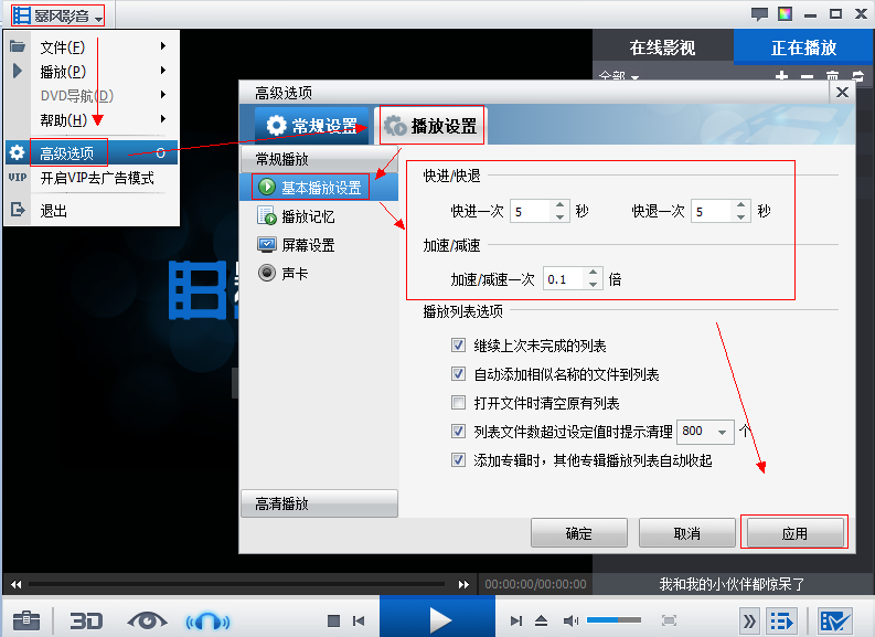 进入高级选项——播放设置——基本播放设置中设置快进/快退一次跳过时间。