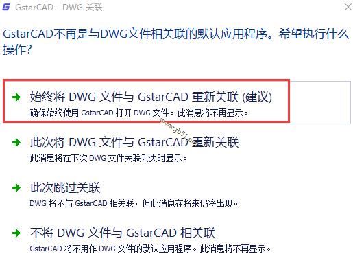 7、建议默认选择(始终将DWG文件与GstarCAD重新关联(建议)),无需更改;
