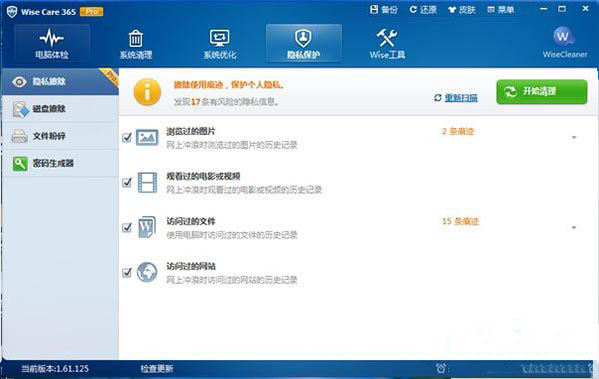 Wise Care 365 Pro能够实现清册表清理,常规清理,计算机痕迹清理、高级清理和系统瘦身。常规清理是非常傻瓜化的,而高级清理的高级设置中,能够让你添加更多不同种类的系统垃圾文件后缀名,从而让清理功能更加强劲。系统瘦身则是可以删除补丁文件、示例音乐和自带壁纸;