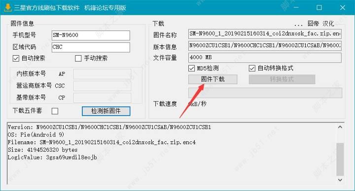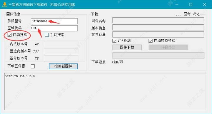 首先,打开SamFirm软件。我们在手机型号栏里添加你的机型型号,我这里以三星Note9为例,别忘了加上SM-这三个字符。随后,在区域代码里填写CHC。