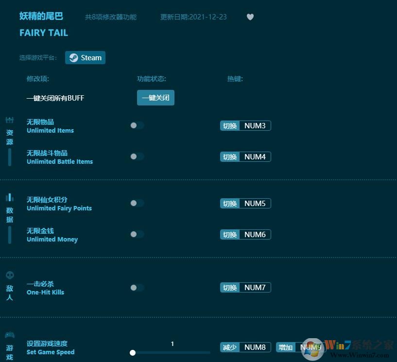 3、运行“妖精的尾巴”游戏4、游戏运行后点击“加个Buff"按钮,当然大家也可以进行单项修改