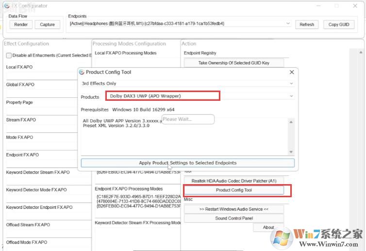 10、选择好设备然后点击Product Config Tool,出现另一个窗口后,选择Dolby DAX3 UWP (APO Wrapper),应用激活