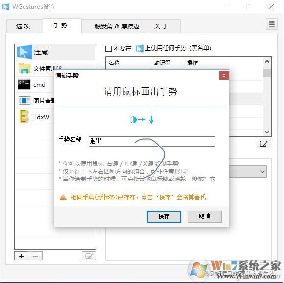 当然如果你觉得全局手势不符合你的要求,还可以自行进行编辑。如在手势列表选中上述退出手势,点击“编辑”,在弹出的窗口按照屏幕提示按住触摸板的右键并画出自己需要的手势即可,比如左撇子用户可以画出向左C字形作为退出手势