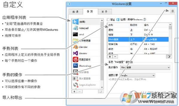 作为一个全局鼠标手势,WGestures可以作用于几乎任何应用程序。除了预定义的手势外,您还可以为任意应用程序添加任意手势。