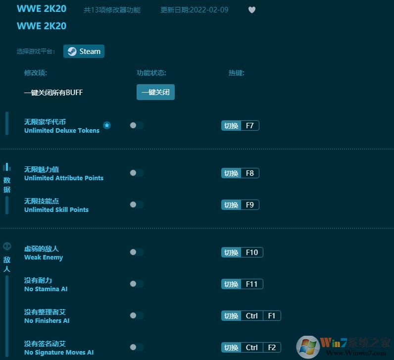 3、运行“WWE 2K20”游戏4、游戏运行后点击“加个Buff"按钮,当然大家也可以进行单项修改