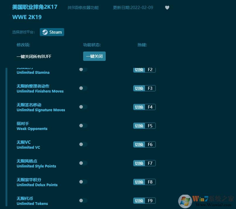 3、运行“美国职业摔角2K17”游戏4、游戏运行后点击“加个Buff"按钮,当然大家也可以进行单项修改