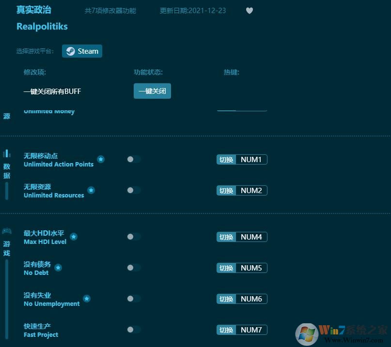 真实政治七项修改器,让你可以轻松的构建属于你自己一个人的帝国,没有失业,没有负债,无限累积的资源等一系列异常强大的修改效果能够帮助你铸就成功,体验模拟真实的政治类游戏,让你过一把当一国国王首脑会是怎么样的感觉。虽然这款游戏非常地有意思但是难度总的来说还是比较大的,而今天为大家带来的这款真实政治七项修改器就可以帮助大家轻松的上手进行游戏,从此以后再也不用害怕会成为一名“昏君”了。喜欢的朋友赶紧来下载吧!