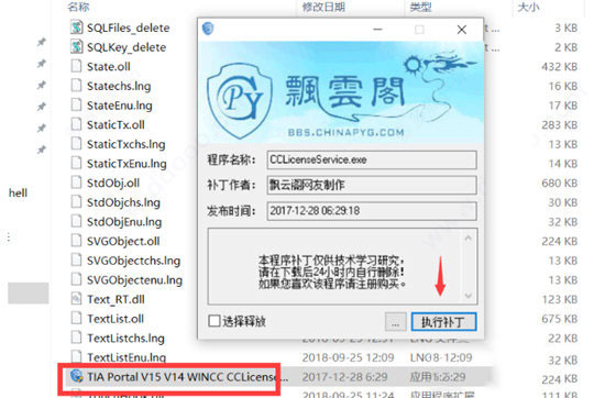 8、安装完成后,运行TIA Portal v15免狗和谐补丁.exe,点执行补丁,硬件狗已经完成破解。