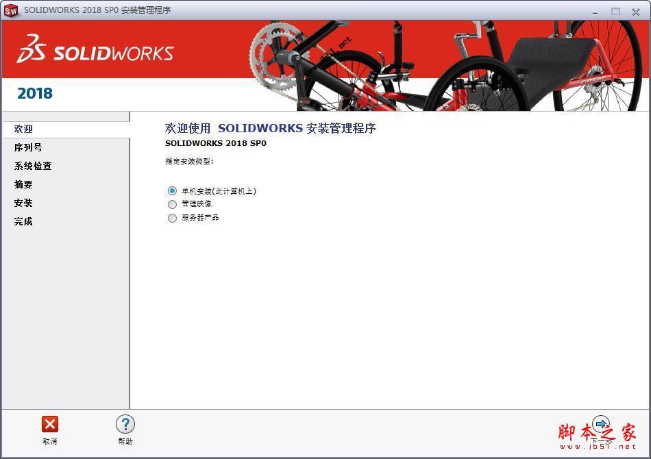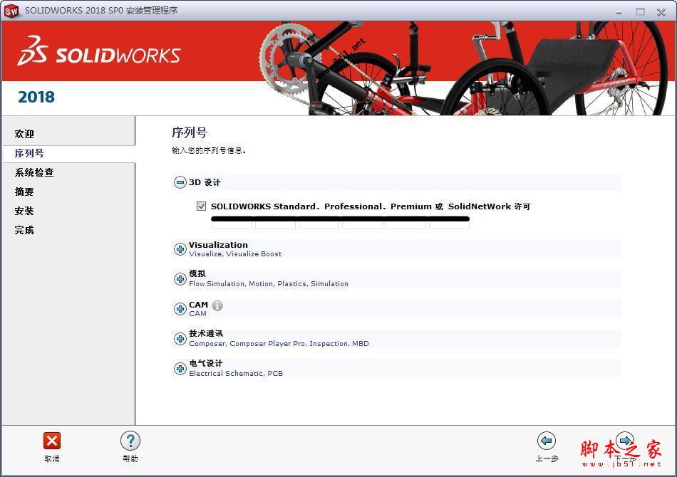12、软件自动检测序列号,通过后点击“下一步”,进行Solidworks2018安装功能和安装目录等设置,设置完成后勾选接受条款,点击“开始安装”,直至安装完成。