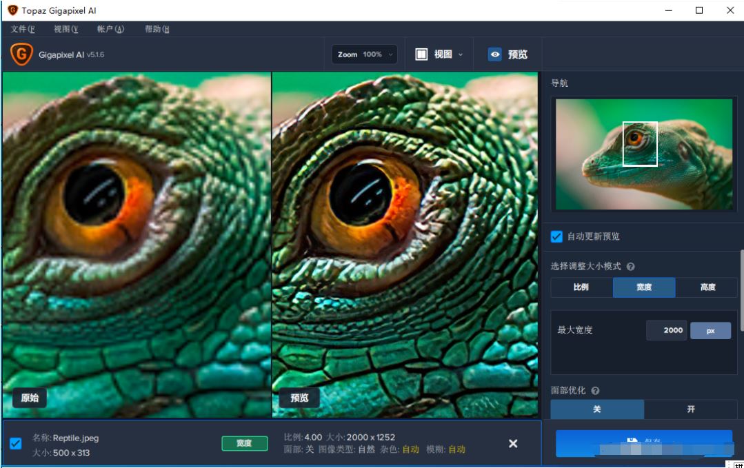 topaz gigapixel ai v5.4.5中文汉化版,这是一款专业的无损图片放大工具,也是目前唯一一个使用人工智能来扩展图像且添加自然细节以获得惊人效果的应用,采用了AI深度学习技术,通过该工具我们可以600%的还原度完美保留图像质量,让低分辨率图片转为高分辨率、高质量图片,即使在训练了数百万个样本图像之后,软件依旧能够以惊人的质量级别放大图像,从而为你提供尽可能多的细节和清晰度的结果。使用AI人工智能放大图片