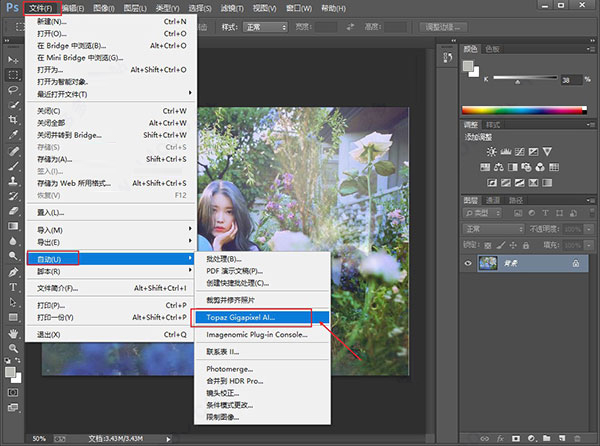 然后在PS菜单的“文件”——“自动”——“Topaz Gigapixel AI”即可调用软件,如下图所示: