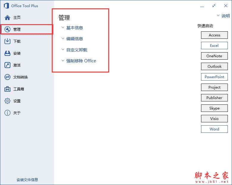 3、管理 Office。通过 OTP,你可以查看当前 Office 的信息,配置当前 Office 的更新。还可以一次性卸载多个版本的 Office,或者删除某个语言包。OTP 还提供官方卸载工具和脚本,一键清除 Office 残留。