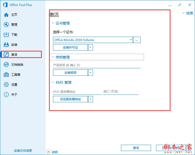 4、激活 Office。OTP 可以安装/卸载密钥、转换 Office 授权版本、配置 KMS 服务器地址、清除激活信息或者是证书、查询当前 Office 的激活信息。无论是联网激活、电话激活还是 KMS 激活, OTP 都可以轻松应付。(PS:OTP 不存在破解行为,只有配置 KMS 的功能)