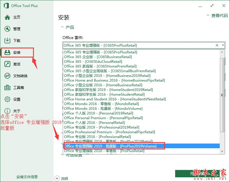 1、安装---Office套件里选择:Office 专业增强版 2019 - 批量版 - [ProPlus2019Volume]。(visio project 其他产品等 都可以随意选择,在这就不多做表述了。)
