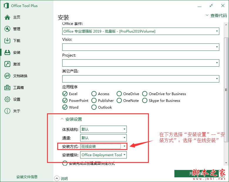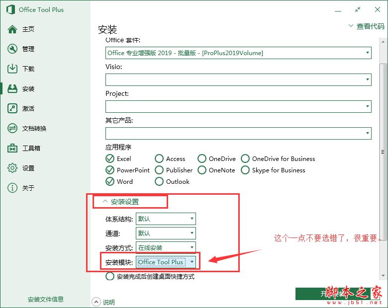 3、安装---安装设置---安装模块:Office Tool Plus(重要)红起来要考(win7系统安装一定要这样选,win10系统选office deployment tool)