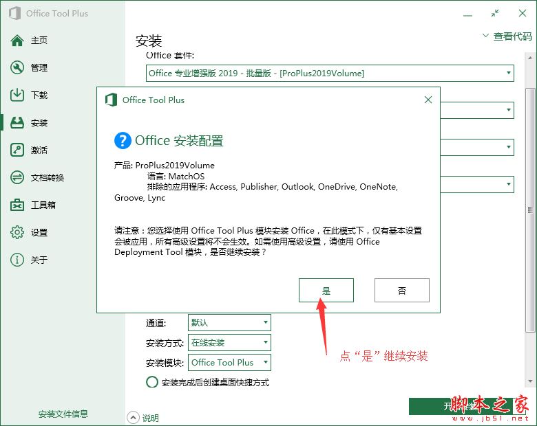 5、开始安装后将会出现“office安装配置”提醒,选择“是”即可。