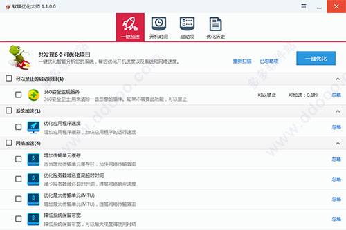贴心的提供了一键优化功能,让您把最常用的优化安全稳妥的一步到位。还可以开关机加速、上网加速、C盘系统文件夹搬家、定制系统快捷命令、自动登录Windows系统、多系统启动设置、轻松设定阻止任意程序执行……
