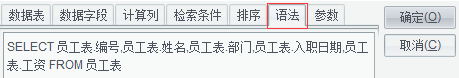 进入SQL编辑器后,可以根据需要切换不同的Tab页,选择要查询的数据表、数据字段、检索条件等,切换到语法Tab页可以看到最终拼接好的SQL语句。当然也可以直接在这里写SQL语句,SQL语句执行返回的结果就是我们制作报表需要的数据集。