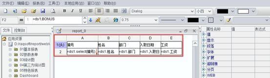 使用select函数从数据集ds1中选取雇员字段列的所有值,该组字段值保留了一个指针,指向数据集中的源记录,该组字段值和数据集中的记录保持一一对应的关系,因此在当前格的附属单元格里可直接通过dsn.colname表达式检索,而不需要重复的使用select函数取数,如B2,C2等。