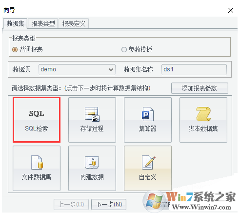 这里我们用demo数据源,制作一个普通报表,如上图所示选择报表类型,数据源和数据集类型、数据集名称可以默认,也可以自定义,选择完以后,点击【下一步】,通过向导编辑SQL数据集。