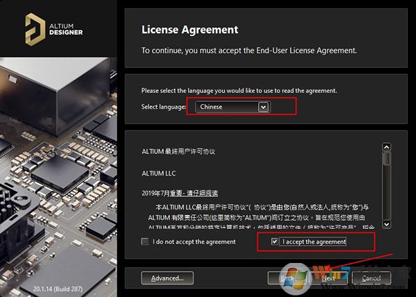 4、先在Select language栏下拉列表中选择“Chinese”,然后勾选“I accept the agreement”,再点击Next;