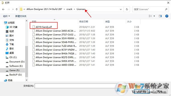 10、将会弹出一个窗口,然后打开软件初始安装包Crack文件夹,找到AD19-Sandy.alf文件,单击选中它后再点击打开;