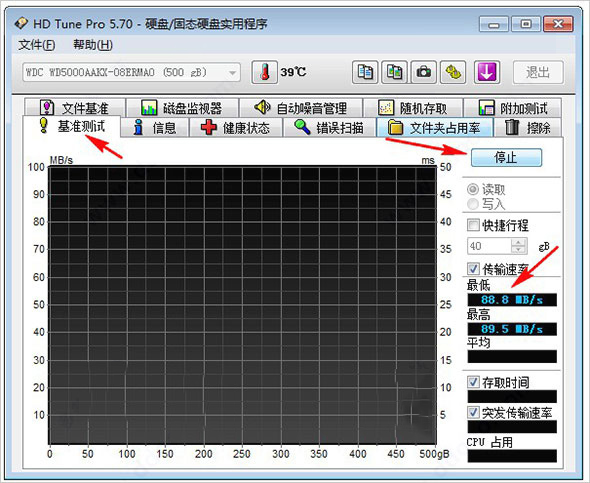 1、如果买了一个新的硬盘可以通过基准功能测试一下硬盘的读写速度,读写测试是单选的请注意选择。值得注意看的是最低的速度和最高的速度;