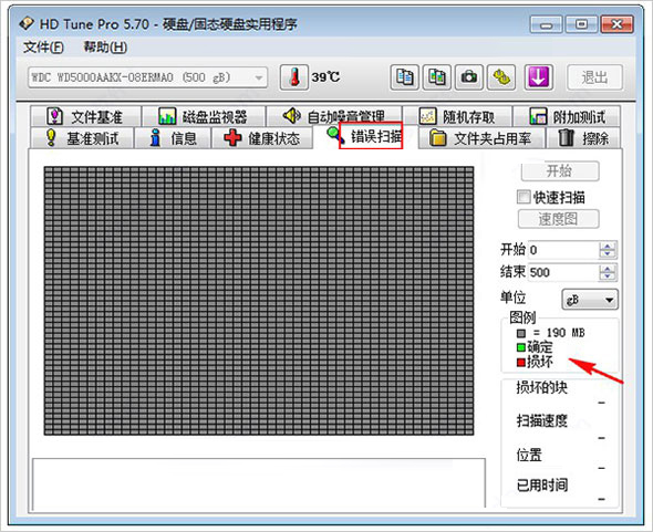 2、错误扫描就是扫硬盘有没有坏道,如果硬盘上有坏道会导致系统卡顿死机这一类的现象。如果有在HD Tune表现就是显示示红色的小方块。正常会显示示绿色的方块;
