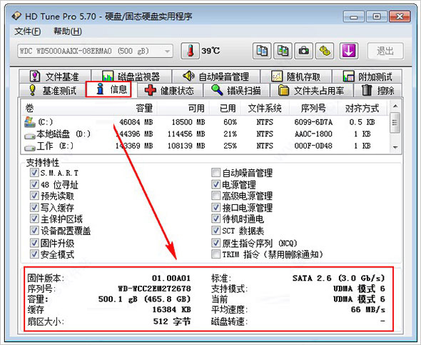 “信息”项是查看硬盘的基本信息包括支持的特性、固件版本、硬盘容量、扇区大小等基本信息。