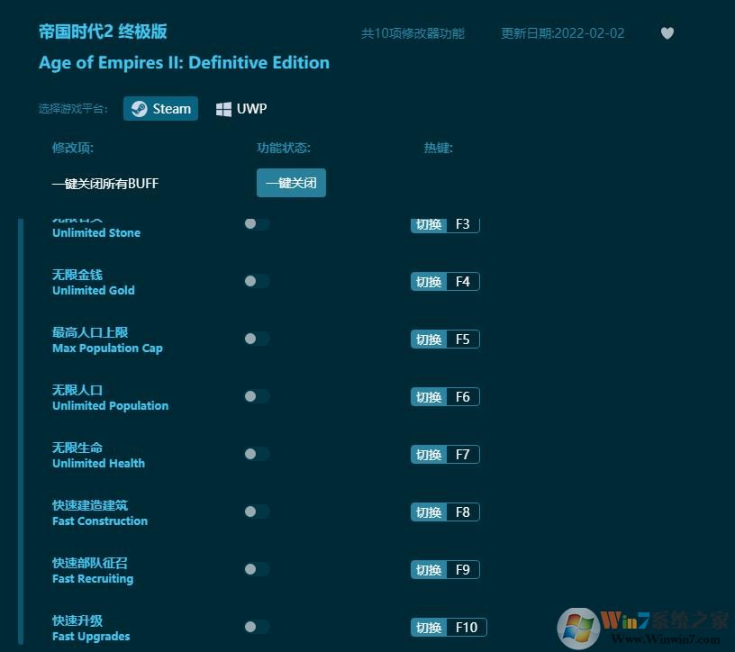 以上便是winwin7下载小编给大家分享介绍的帝国时代2十项修改器,对《帝国时代2 终极版》游戏玩家来说是非常不错的一个选择!