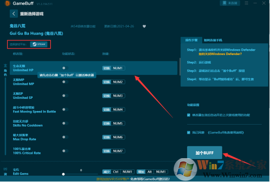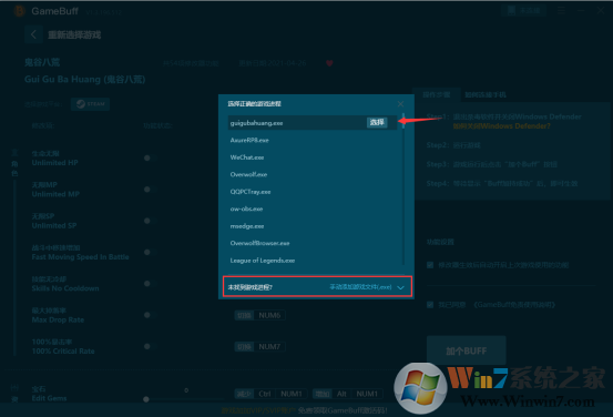 4、优先启动游戏,才能根据游戏的进程,进行注入修改,如自动检测没有该游戏的正确进程可以手动在文件夹进行添加。然后点击加个BUFF,启动即可。