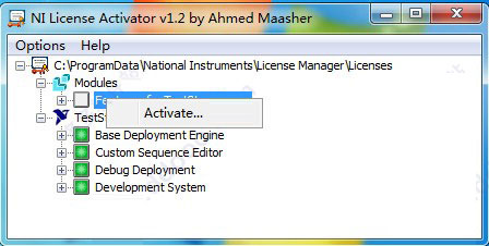 7、运行注册机“NI License Activator 1.2.exe”,右键选择目标,点击【Activate…】,成功后方块内会填充为绿色