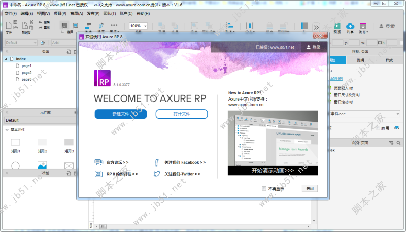 ③ 启动 Axure 即可看到简体中文界面, 说明已成功汉化,如果仍为英文则一定是汉化文件位置不正确。