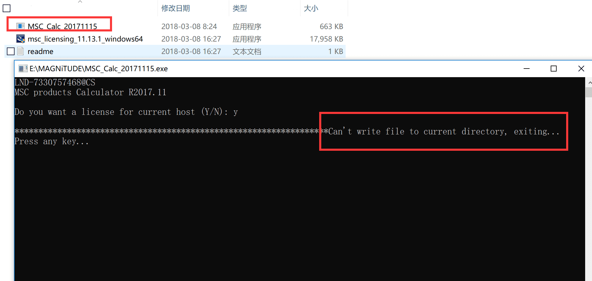 2、运行补丁文件夹内的MSC_Calc_20171115.exe,点y,生成激活文件,提示*Can"t write file to current directory, exiting.. ,说明权限不够