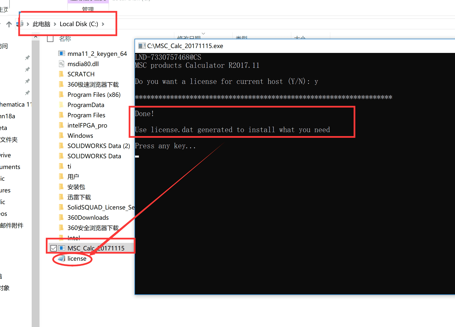 3、我们将MSC_Calc_20171115.exe移动到c盘根目录,再次运行点y,生成激活文件license.dat