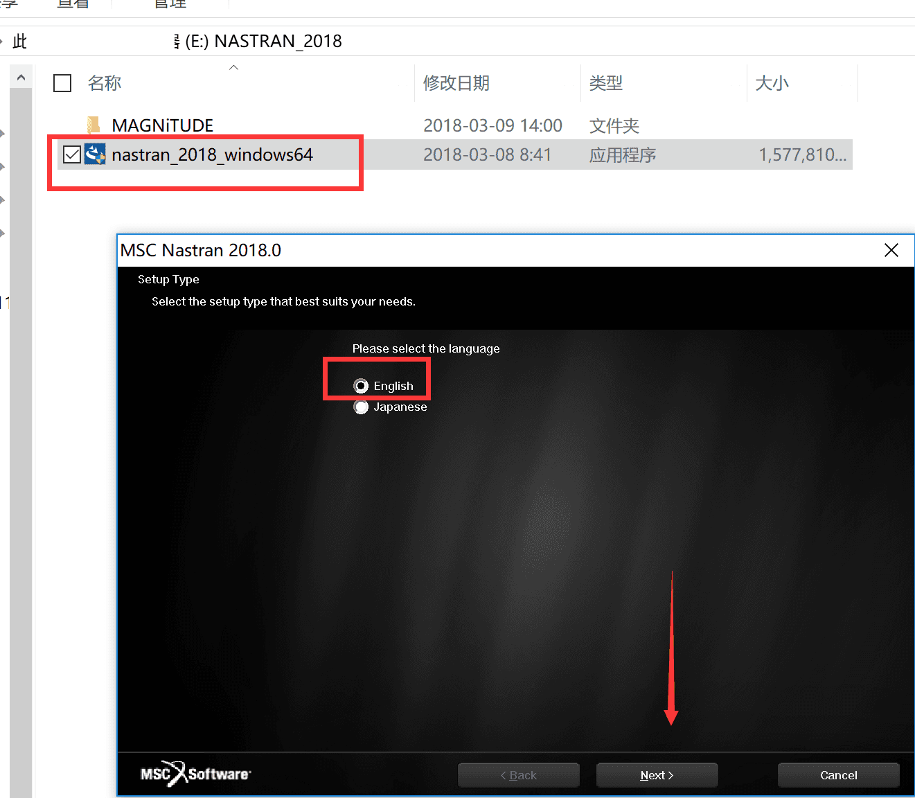 14、激活文件破解完成,我们开始安装MSC Nastran 2018,小编是64位系统,选择disk1内的nastran_2018_windows64.exe.默认英语,点next,如下图所示: