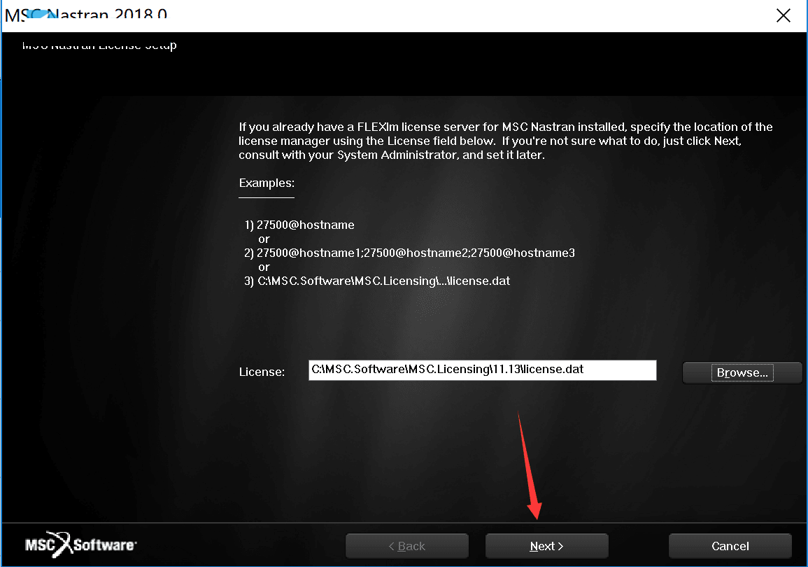 20、弹出授权激活界面,点击Borwse...,选择C:\MSC.Software\MSC.Licensing\11.13目录下的“license.dat"文件,如下图所示: