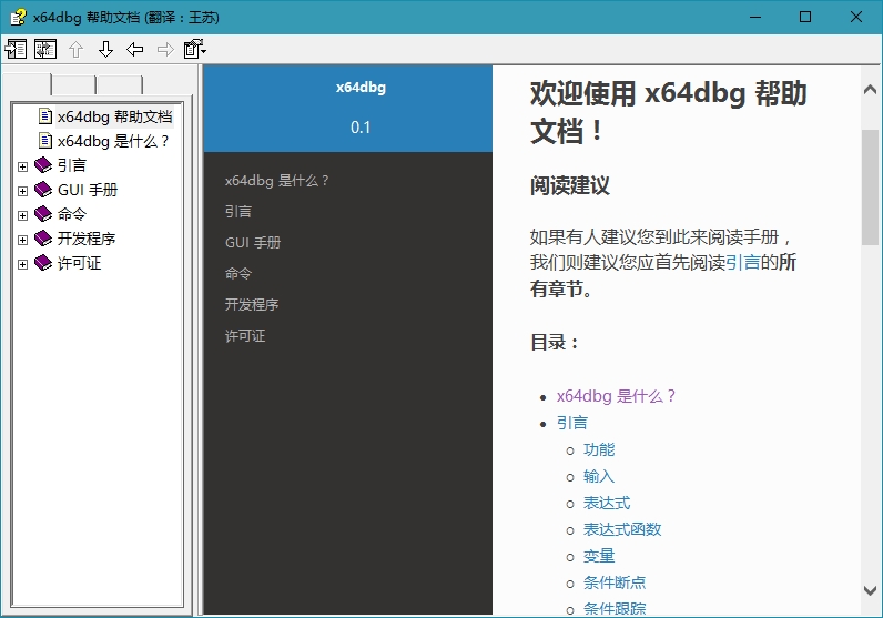 3. 对 x64dbg 帮助文档的主要内容进行了汉化,并按照最新版进行了修订、翻译。对界面字体以及布局重新进行了设置。将默认调用在线英文帮助更改为调用本地的中文帮助文件。