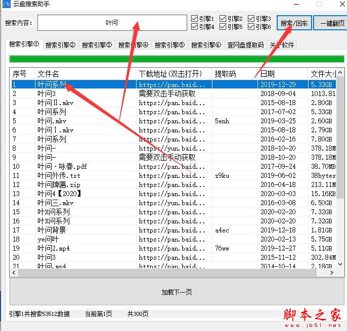 输入需要搜索内容,选择要用的引擎,搜索即可!选择一个搜索结果,双击可直达云盘