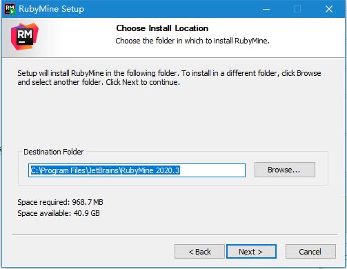 3、安装目录默认为【C:\Program Files\JetBrains\RubyMine 20xx】建议不更改以便后面的操作,如下图所示: