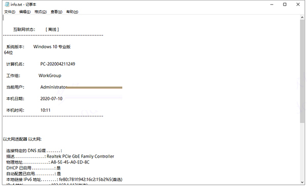 3、可以通过记事本的功能将您的本机信息显示在txt上,见下图所示: