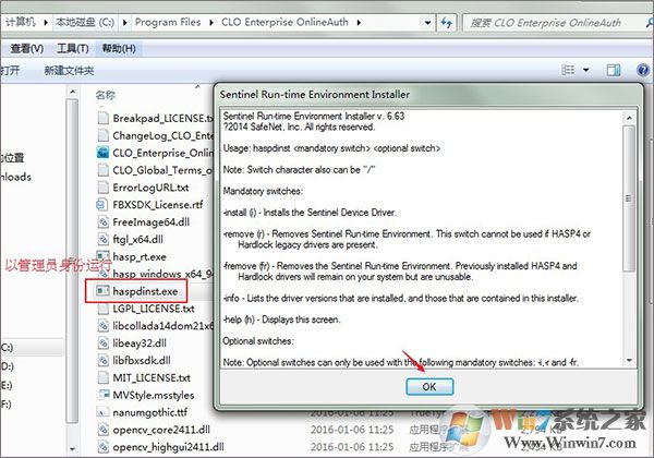 7、再以管理员的身份运行"haspdinst.exe"程序,弹出以下弹框,点击OK;