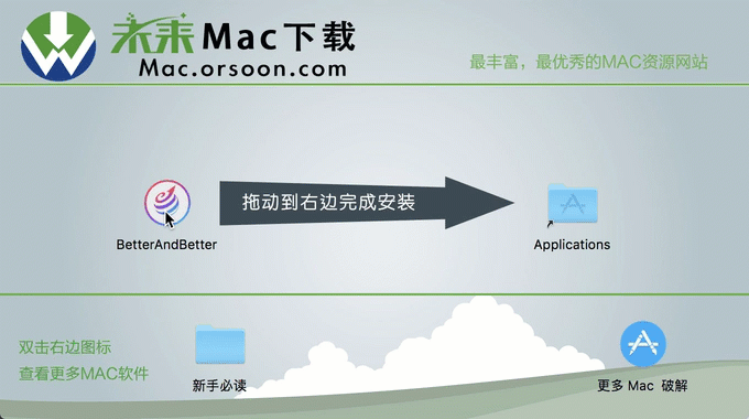从winwin7下载站下载安装包,双击打开,将左侧的【betterandbetter】拉到右侧应用程序中即可,如下图详细草走步骤所示: