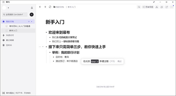 幕布PC客户端是一款能够将思维以树形结构方式快速整理,书写成文的思维导图软件,用户可以用更高效的方式和清晰的结构来记录笔记、管理任务、制定工作计划、头脑风暴,帮助用户释放您的大脑,与传统笔记工具以平面式叙事形式的记录方式不同的是,幕布思维导图更专注结构化的思维记录,把笔记结构化记录,条例清晰,层层分明,便于加深用户的理解。使用过程需要用到 Enter、Tab和Shift+Tab 三个快捷键,书写结果采用树形结构分布,整个过程简单上手,结果直接预览或者一键转化成思维导图。