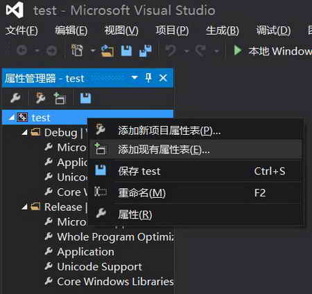 属性管理器 -> 右键 "test"(工程名) -> 添加现有属性表