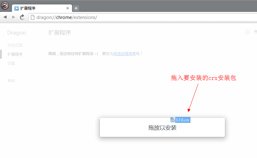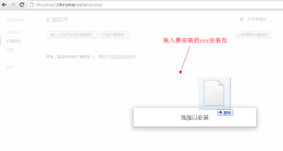 3.将本地的插件包(*.crx)拖入扩展管理页面。