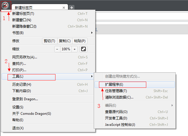 打开浏览器 —>左上角科摩多图标 —>工具 —>扩展程序;拖入要安装的crx安装包,具体参考下图: