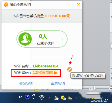 1、安装好之后,点击下方wifi图标,点击“开启免费wifi”功能即可使用,如WinWin7分享的图片: